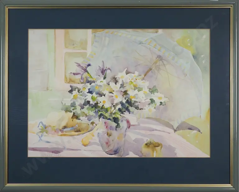 Sarah Bibra. Still Life - Flowers & Umbrella. Watercolour.