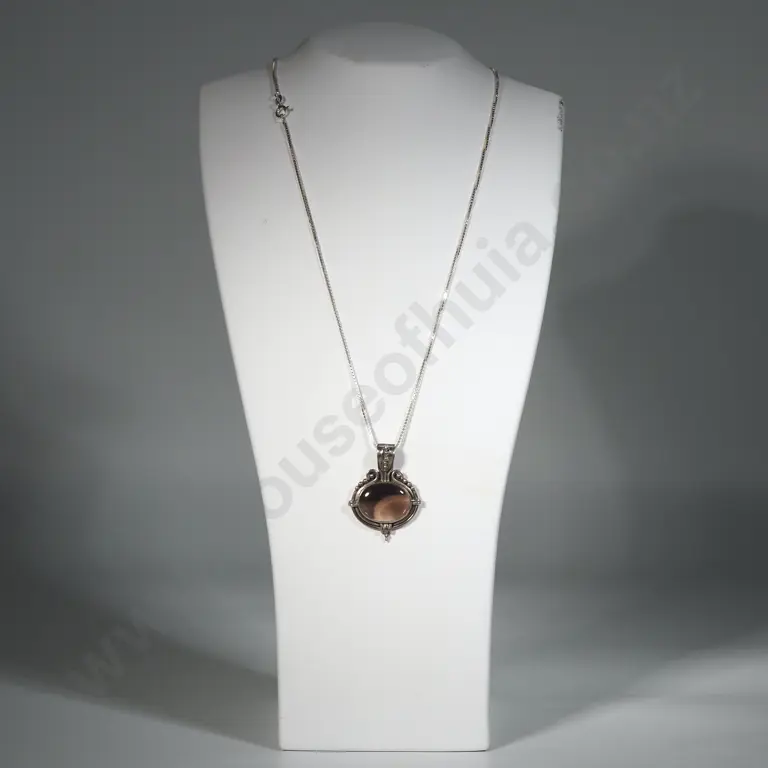 Sterling Silver & Brown Oval Cabochon Stone (Possibly Smokey Quartz) Pendant with Box Link Chain