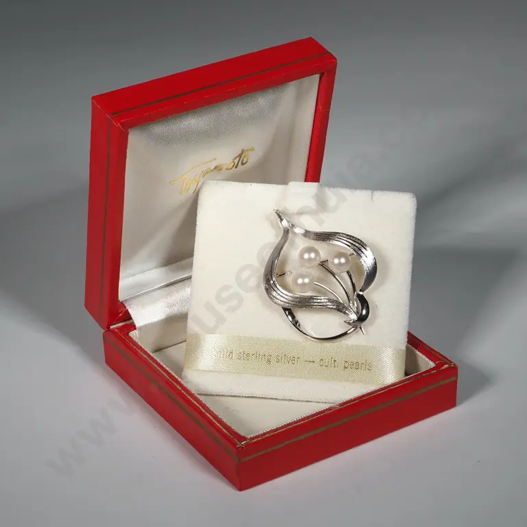 Boxed Toyomoto Sterling Silver & Cultured Pearl Brooch.