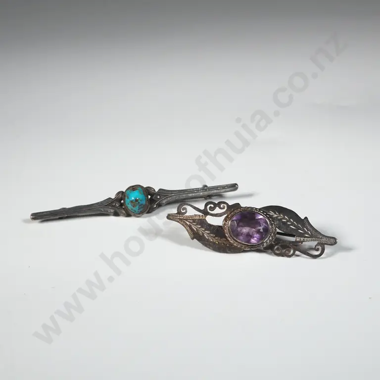 Two Vintage Sterling Silver Bar Brooches. One Set With An Amethyst & The Other With A Turquoise.