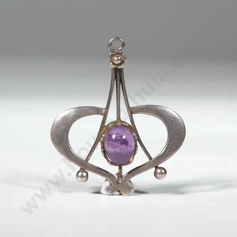 Art Nouveau Sterling Silver Pendant w Cabuchon Amethyst