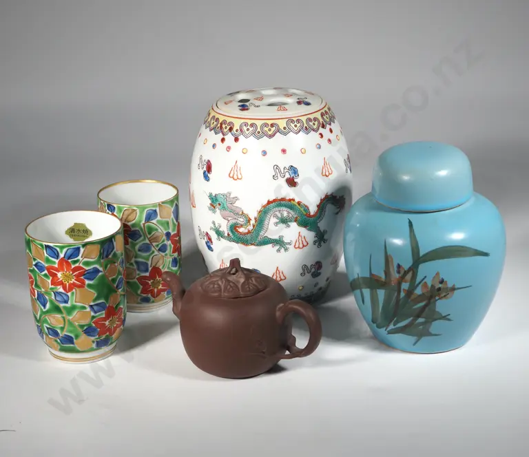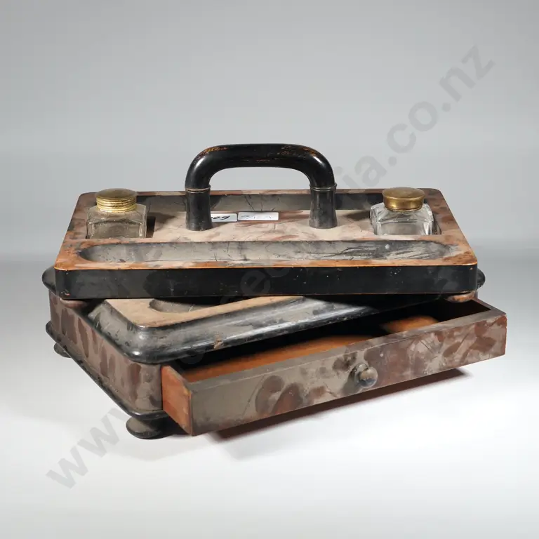 Ceramic Ink Well w Metal Trim & Assorted Writing Implements.